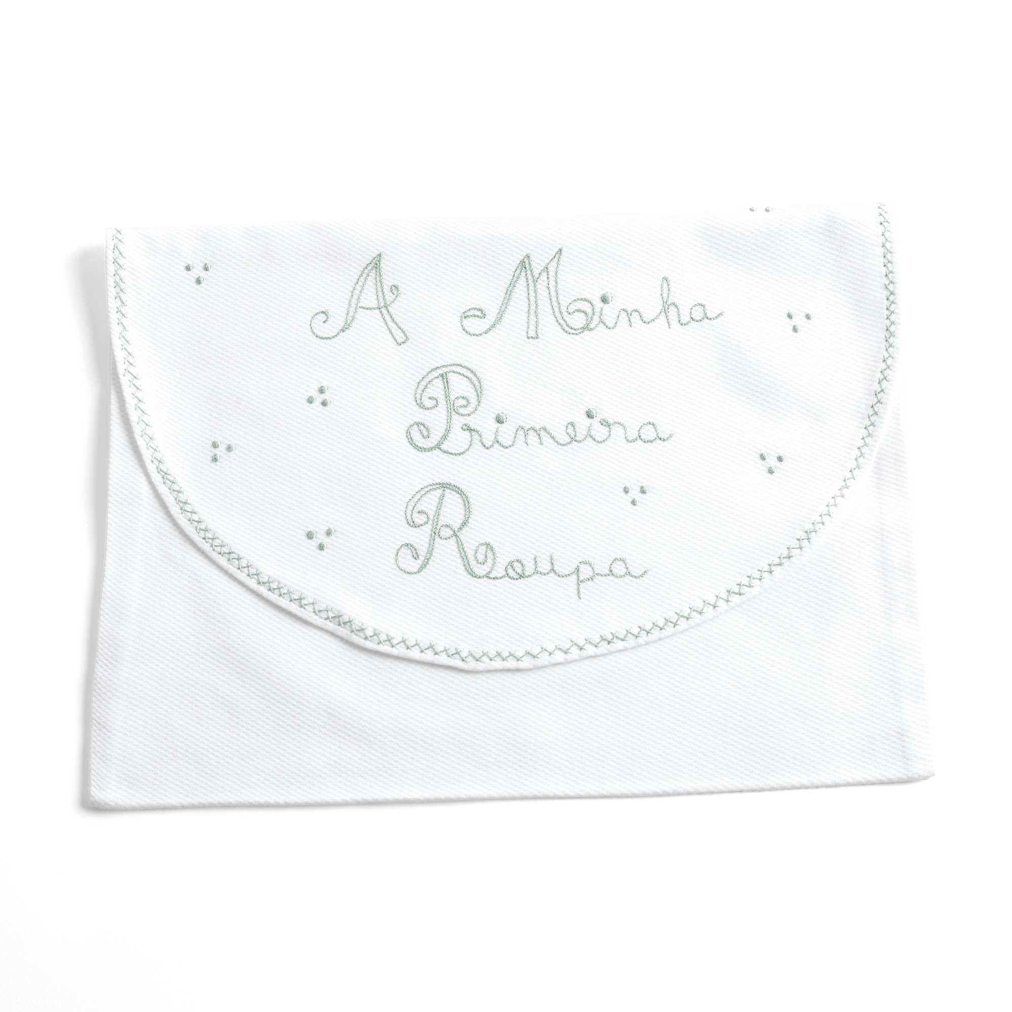 Que se destaca pela suavidade ao toque, além disso, oferece a resistência necessária para proteger a peça mais simbólica do enxoval: a primeira roupa do recém-nascido. O bordado em verde suave, com a inscrição “A Minha Primeira Roupa”, dá-lhe um charme neutro e delicado. Dessa forma, torna-se uma opção perfeita tanto para menino como para menina.