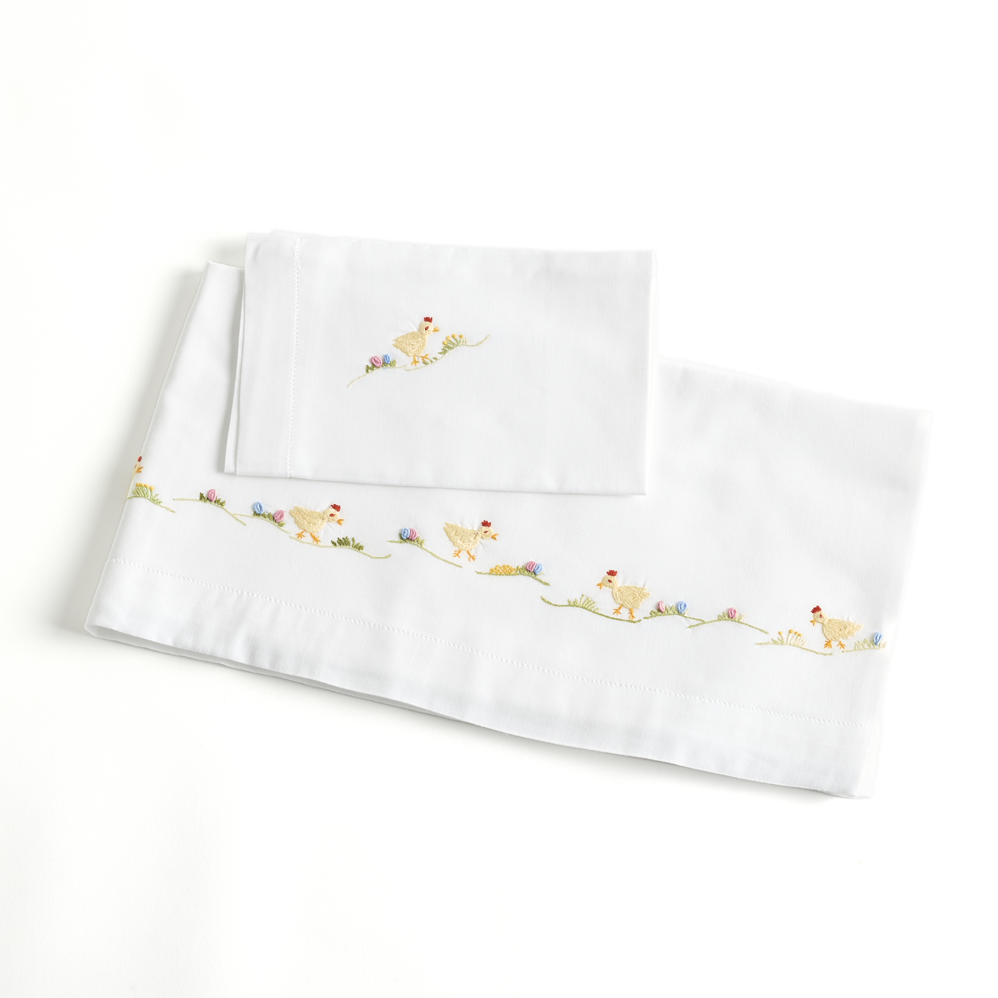 Perfeito para o enxoval de recém-nascido, como presente para chá de bebé, para o batizado ou simplesmente para os primeiros dias em casa, este Lençol com Galinhas bordadas para bebé une qualidade, tradição e charme numa peça exclusiva.