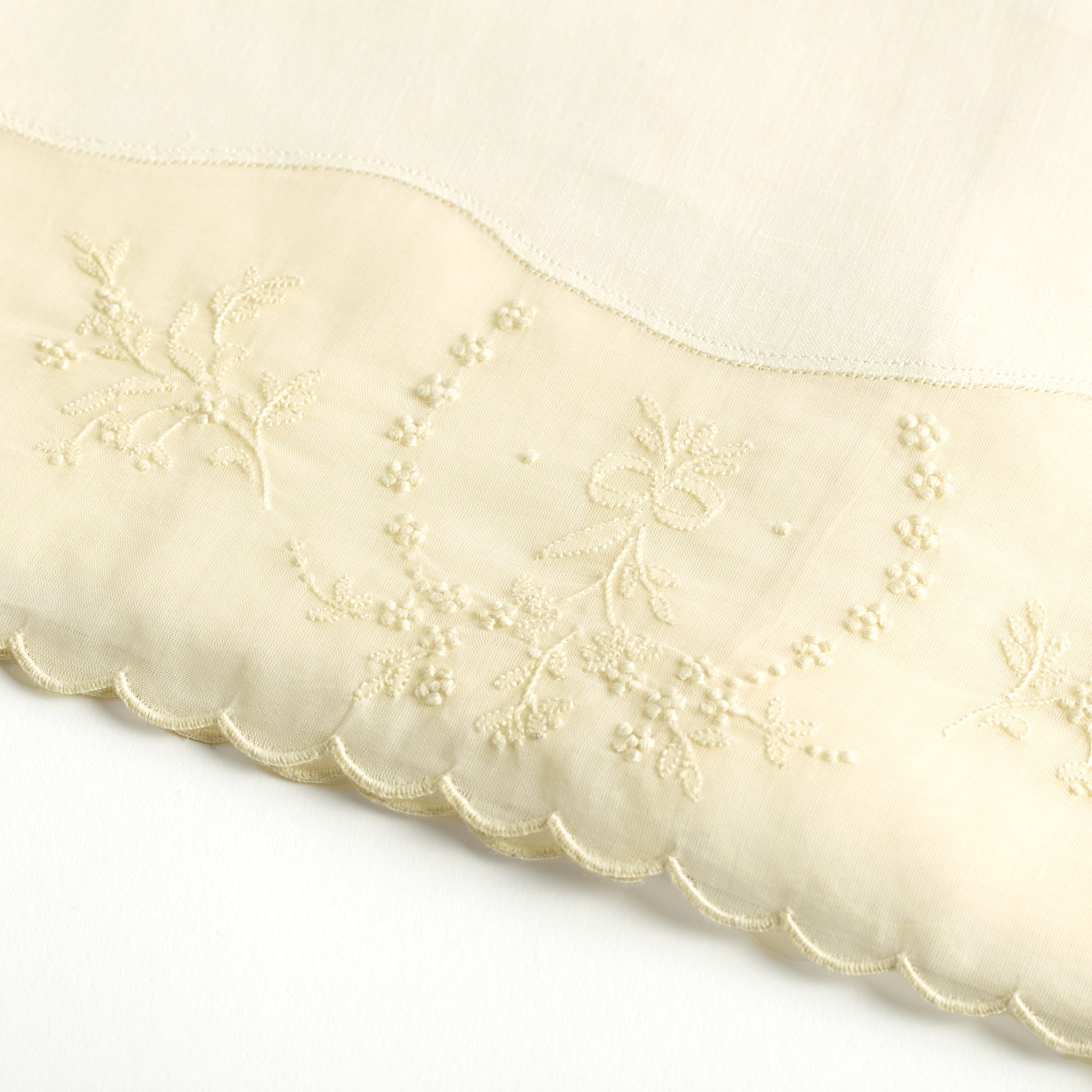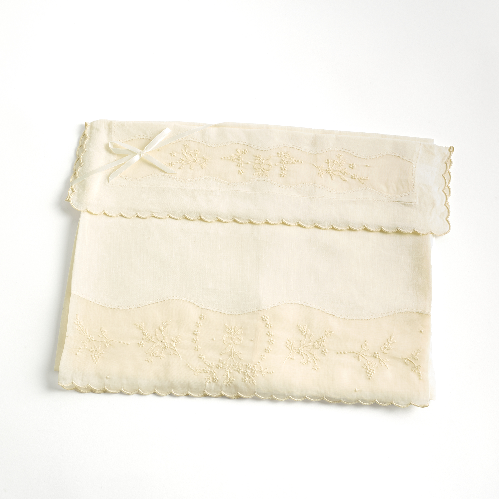 O Lençol em Linho bege com bordado manual de florinhas e laçinhos, ideal para a primeira noite do bebé e batizados até 4 meses. Qualidade, conforto e elegância Babychick.