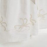 Conjunto de linho composto por saia, camisa e bolsa de roupa bordados a bege.