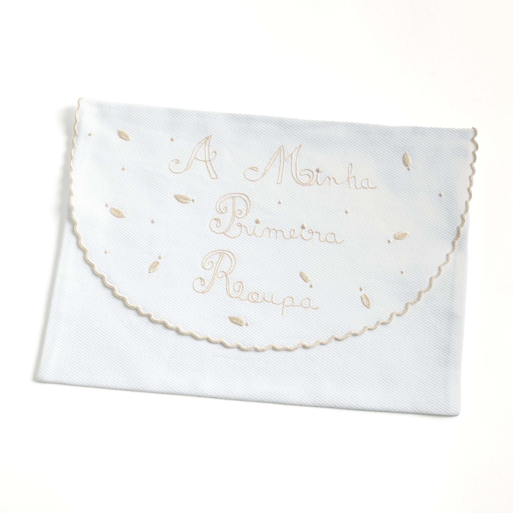 Que se destaca pela suavidade ao toque, além disso, oferece a resistência necessária para proteger a peça mais simbólica do enxoval: a primeira roupa do recém-nascido. O bordado em bege suave, com a inscrição “A Minha Primeira Roupa”, dá-lhe um charme neutro e delicado. Dessa forma, torna-se uma opção perfeita tanto para menino como para menina.