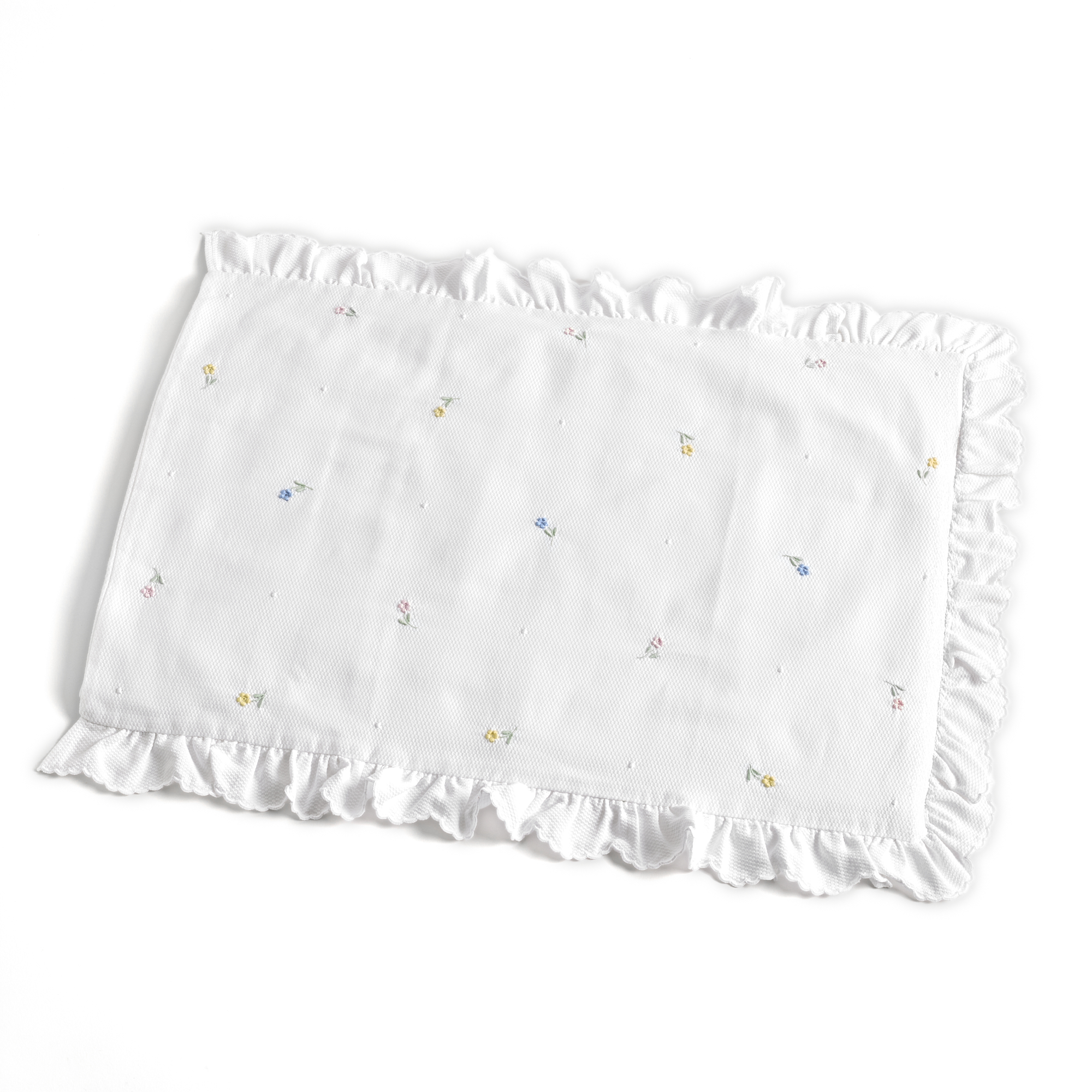 A capa de edredon com flores multicolor para Berço Bordado à mão em piquê, apresenta um delicado bordado sobre um fundo branco, criando um efeito visual leve e muito delicado.