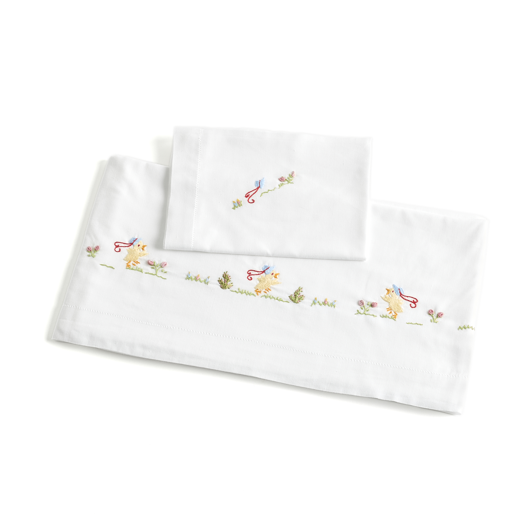 O destaque deste lençol está no delicado bordado manual de pintainhos amarelos, executado por artesãos portugueses experientes.