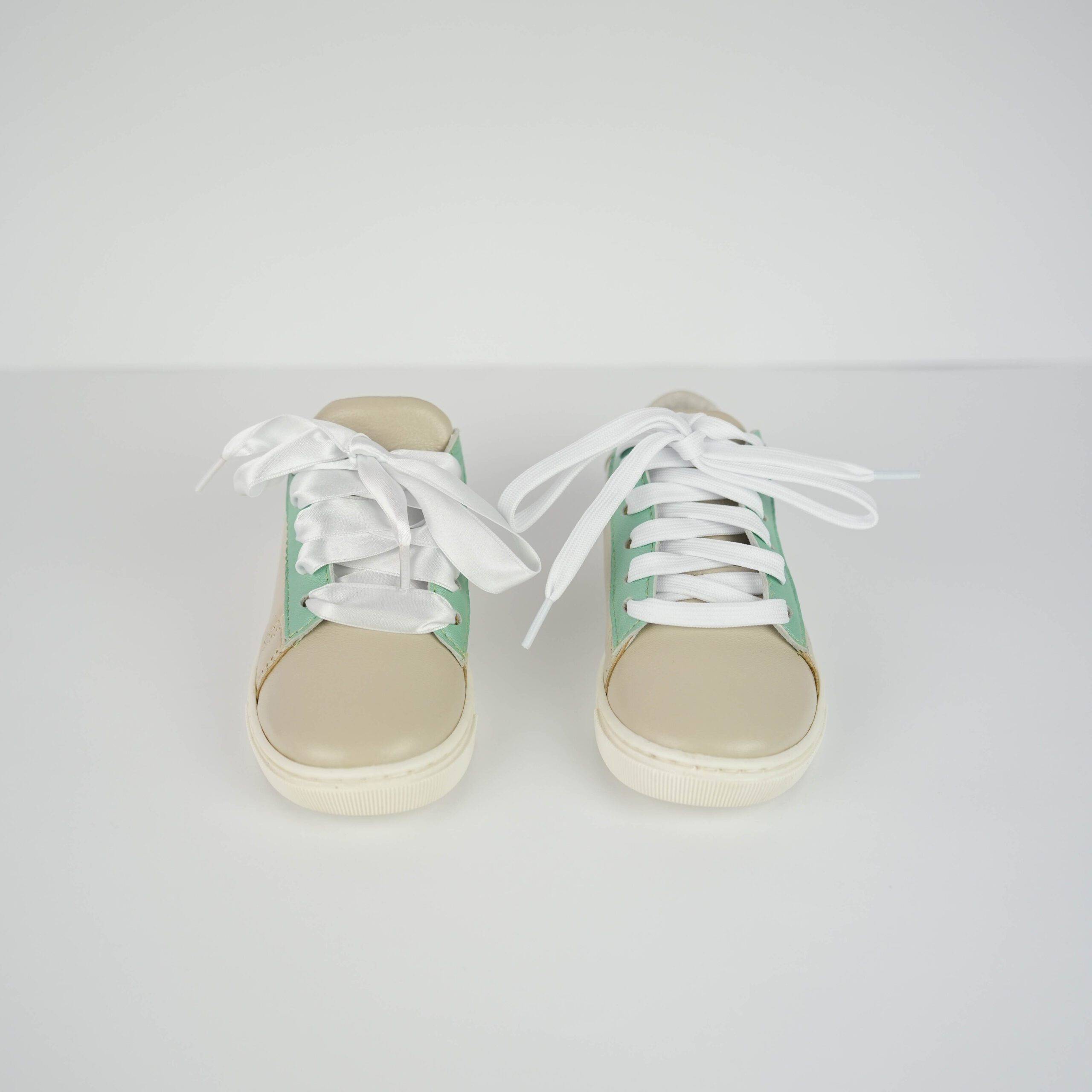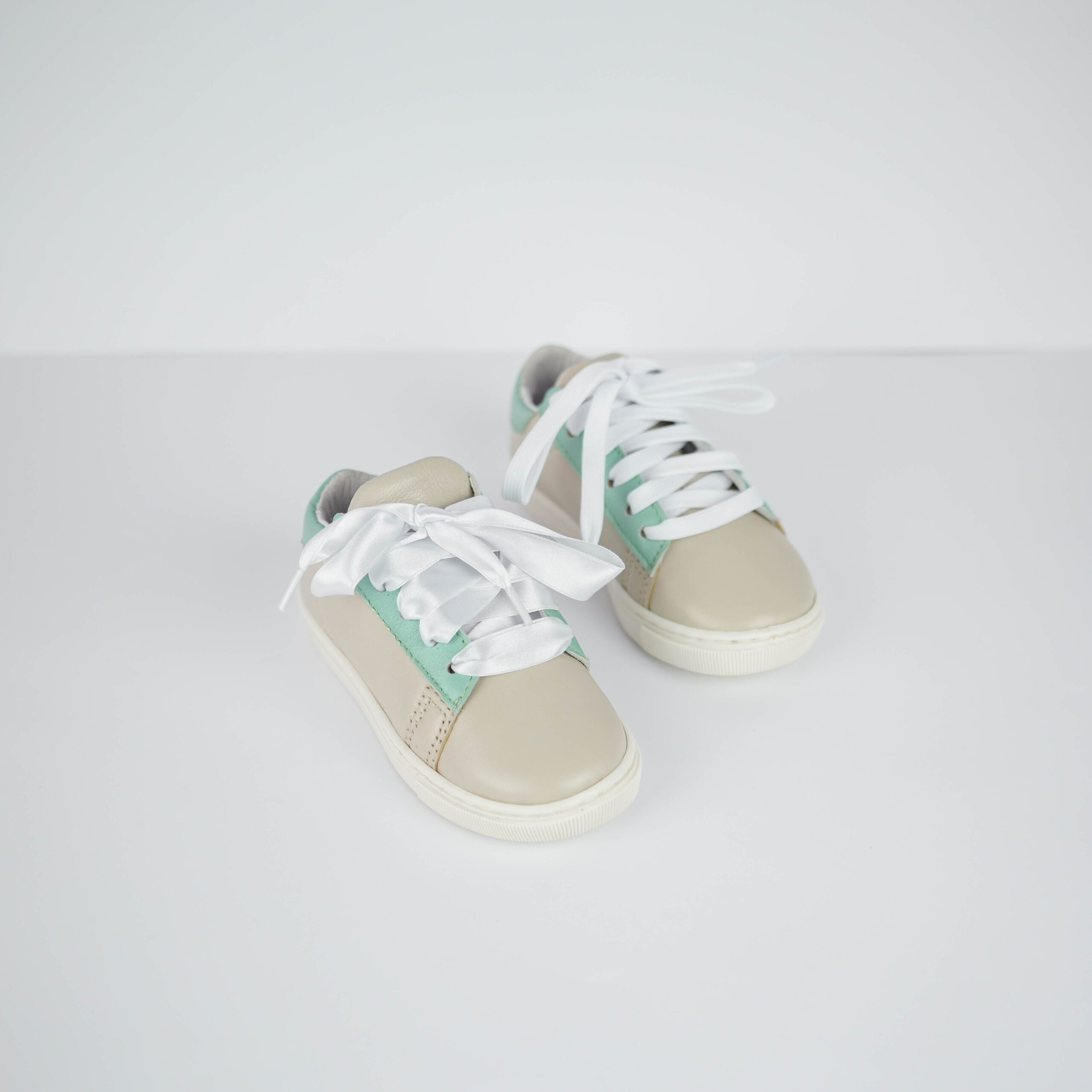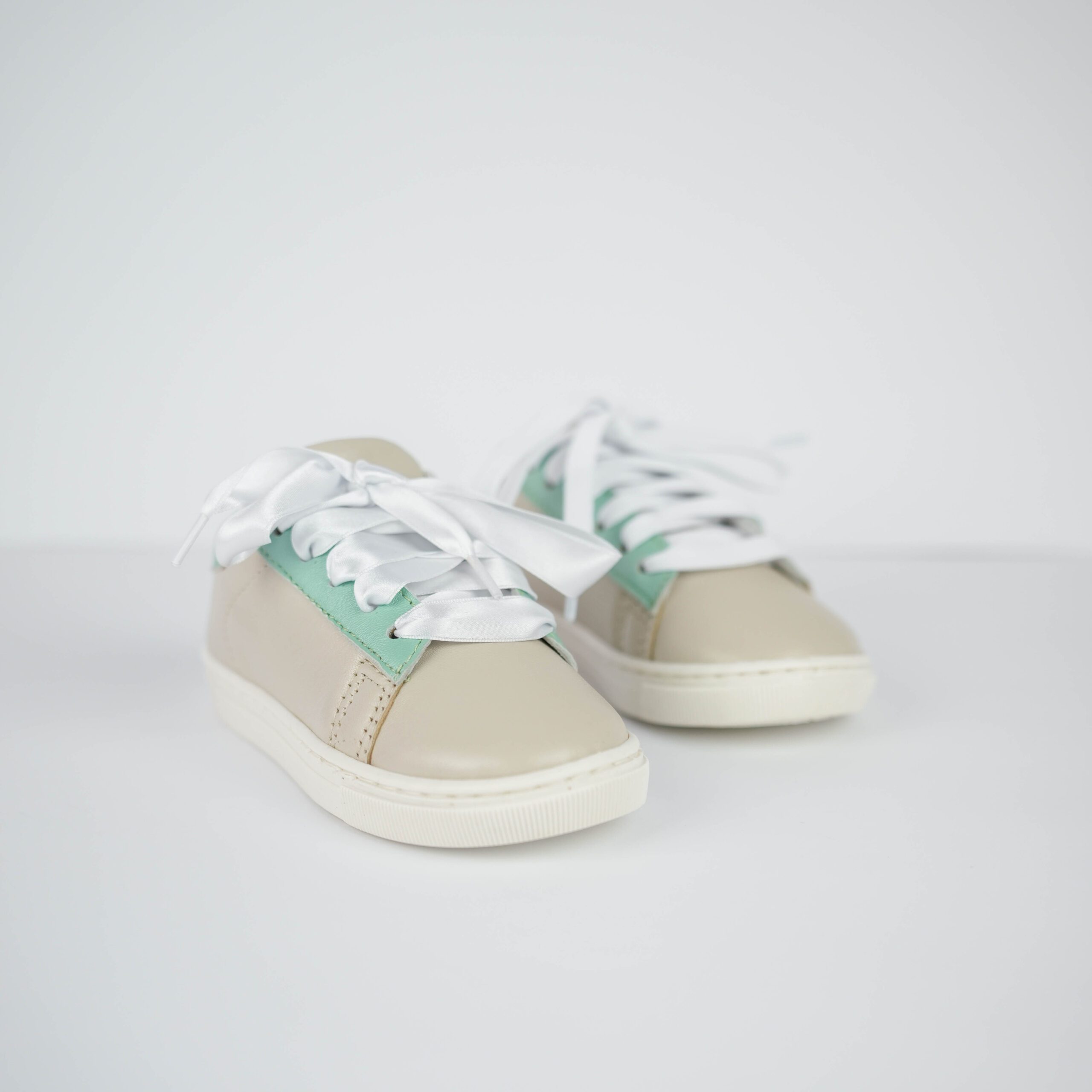 Sapatilhas em pele em bege e verde, selecionado pela Babychick, é um verdadeiro ícone de charme e delicadeza no universo do calçado infantil. Feito em pele genuína e feito à mão, este sapato foi criado com elegância e conforto.
