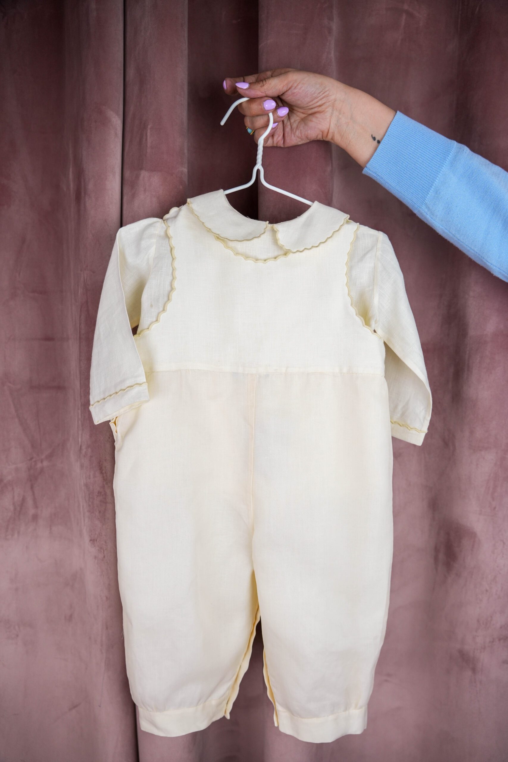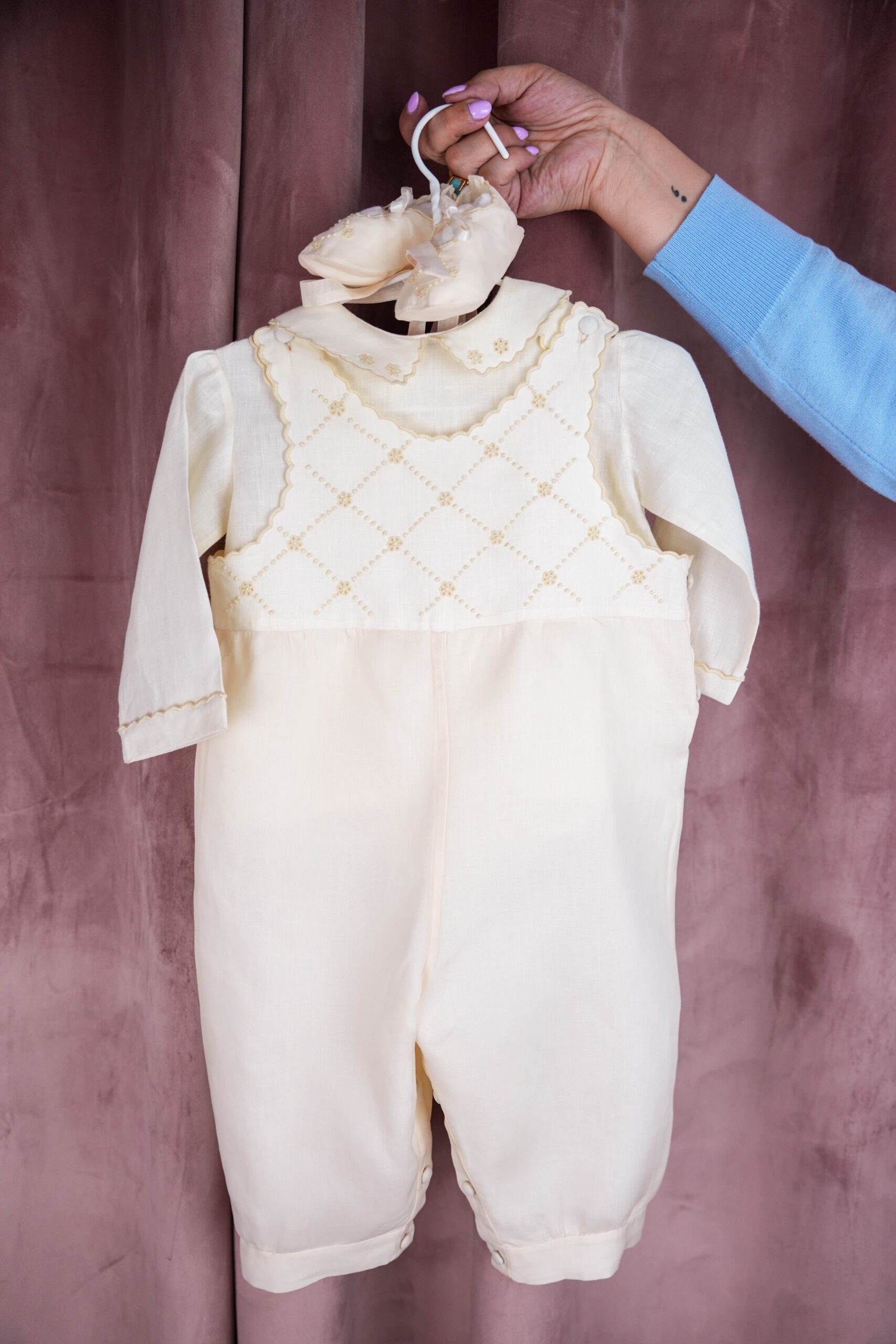O Fato de Batizado Bordado à mão em bege destaca-se como uma escolha clássica e elegante para a cerimónia de batismo do seu bebé. Este conjunto inclui um macacão em bege acompanhado por uma camisa, uma touca e sapatinhos, todos meticulosamente bordados à mão, garantindo um visual harmonioso e sofisticado para este momento especial.