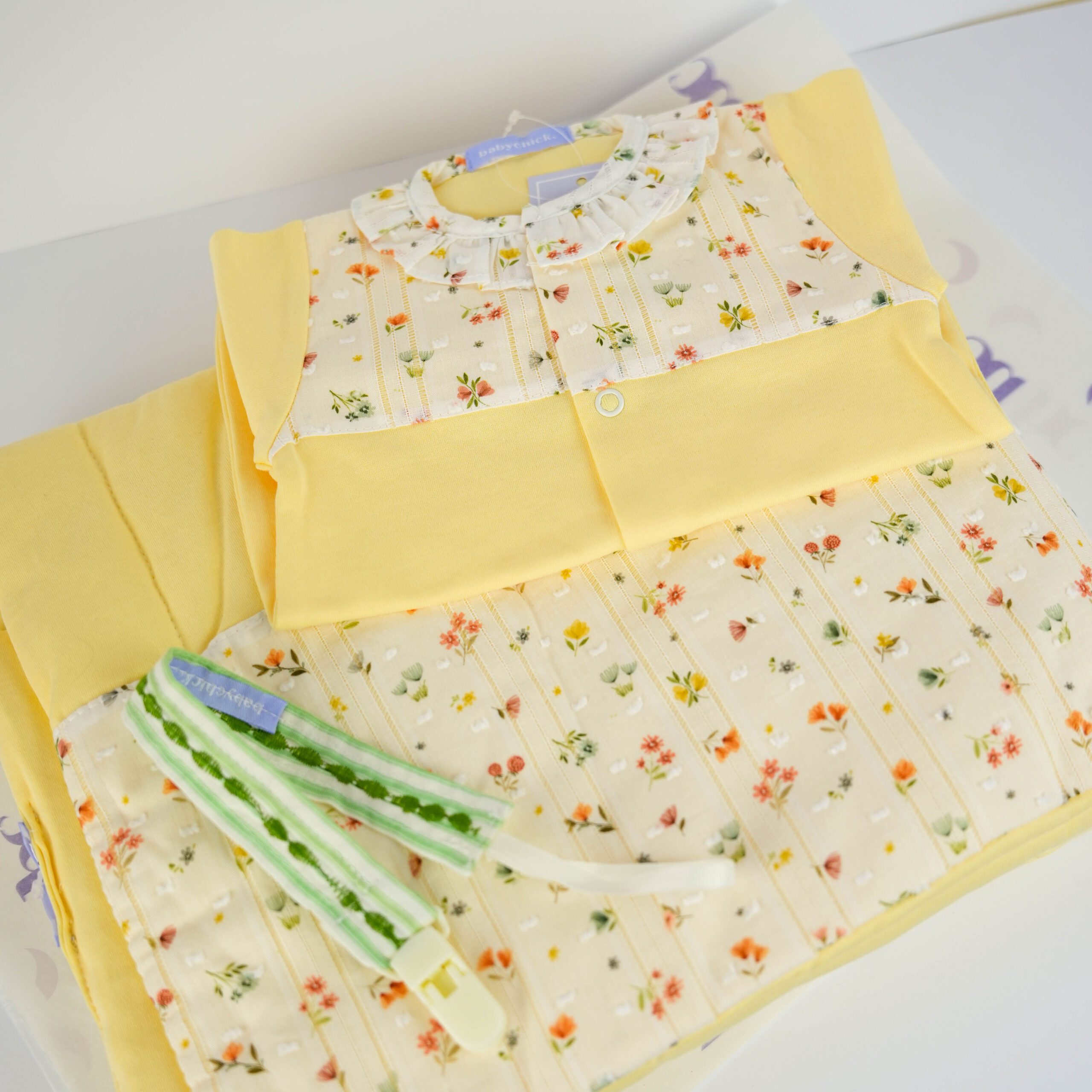 O conjunto foi pensado para envolver o bebé no máximo conforto. Inclui babygrow e manta e prende chucha, cuidadosamente confeccionados para manter o conforto do seu bebé.