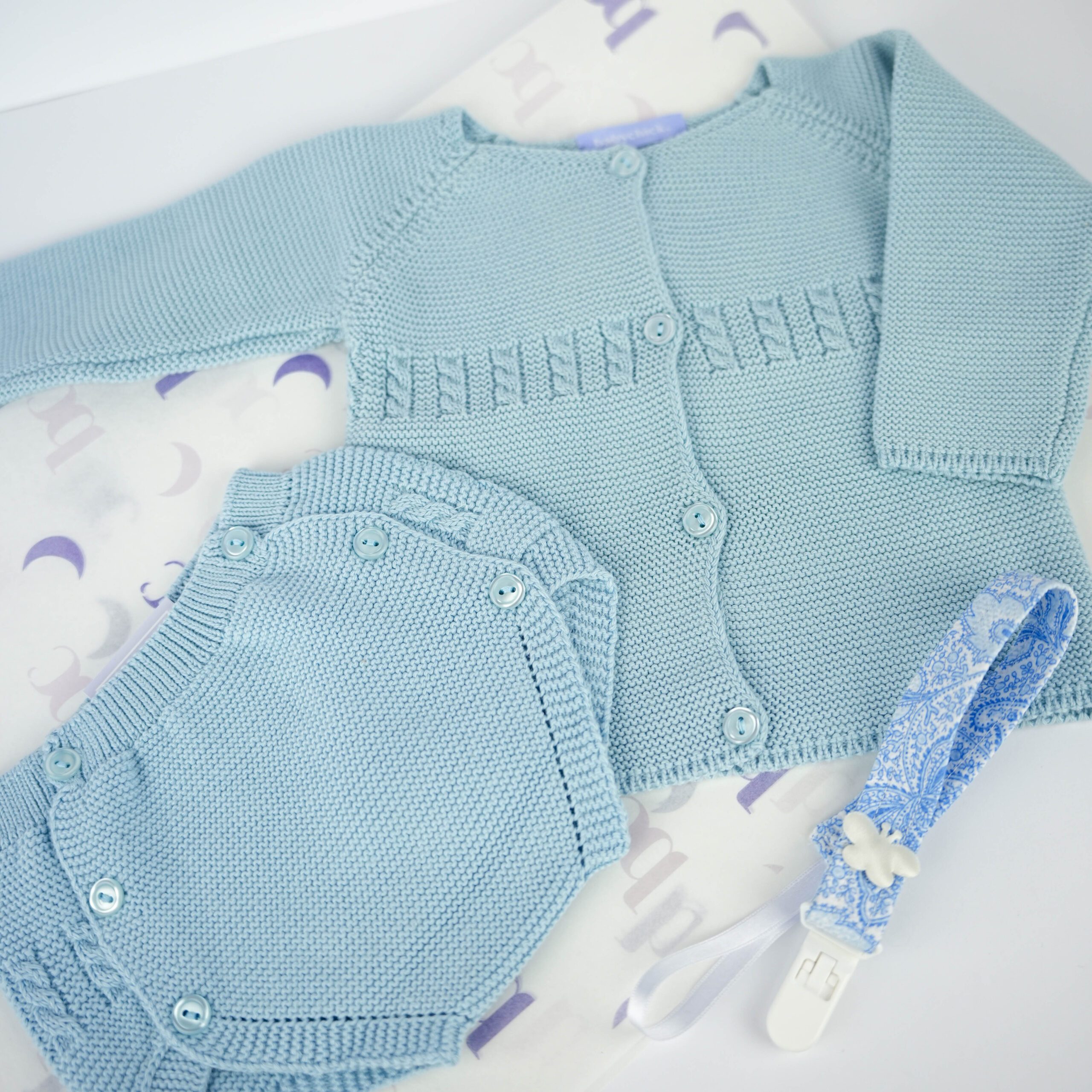 Confeccionado em algodão, Casaco de malha, Tapa Fraldas e Prende Chucha Azul apresenta uma textura suave, leve e respirável. Ajuda a manter a temperatura corporal estável. É uma escolha perfeita para quem procura artigos de qualidade, durável e cheio de carinho, ideal para oferecer ou guardar como lembrança do nascimento de um bebé.