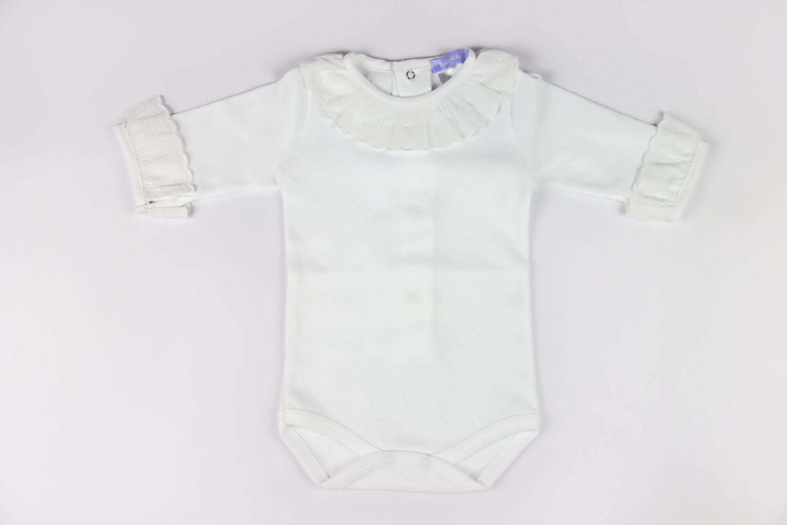 Body de manga comprida com pormenor no punho e gola de bordado inglês. Ideal para combinar numa prenda com a nossa Fralda e Babete Animais.
