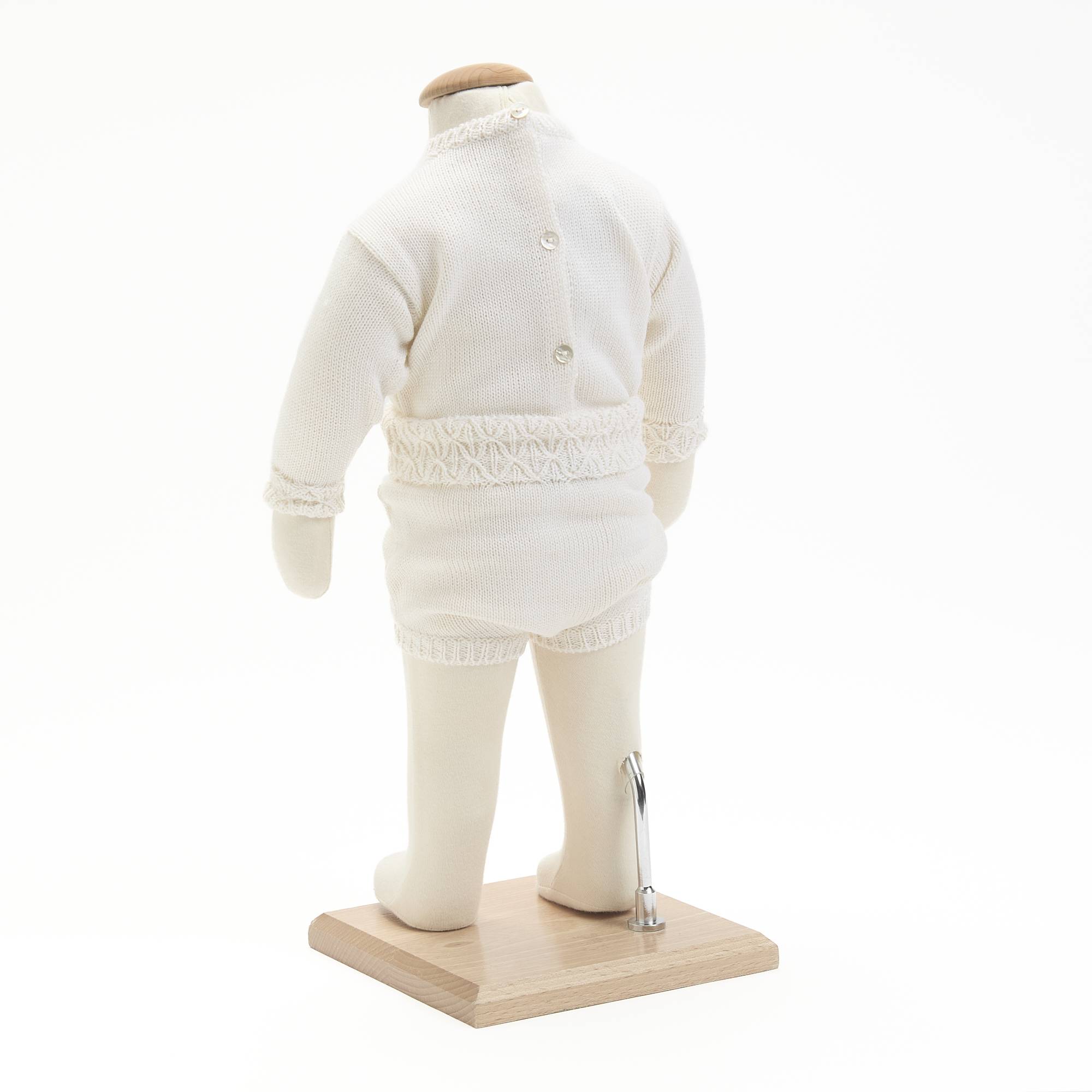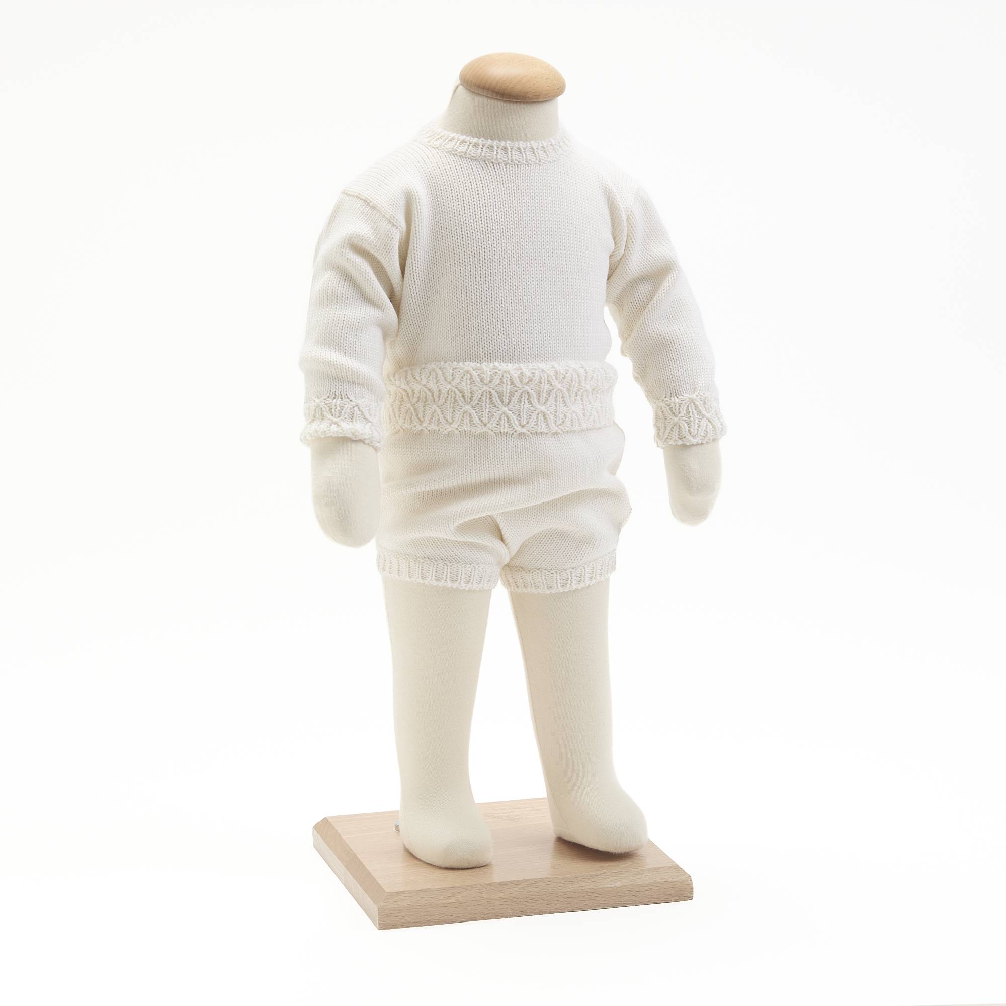 Um conjunto para bebé da Babychick Atelier, criado para envolver o bebé na suavidade e no calor natural da lã merino. Composto por camisola em malha e tapa fraldas a condizer, é cuidadosamente confeccionado de forma artesanal, garantindo conforto, elegância e um toque de ternura em cada detalhe.