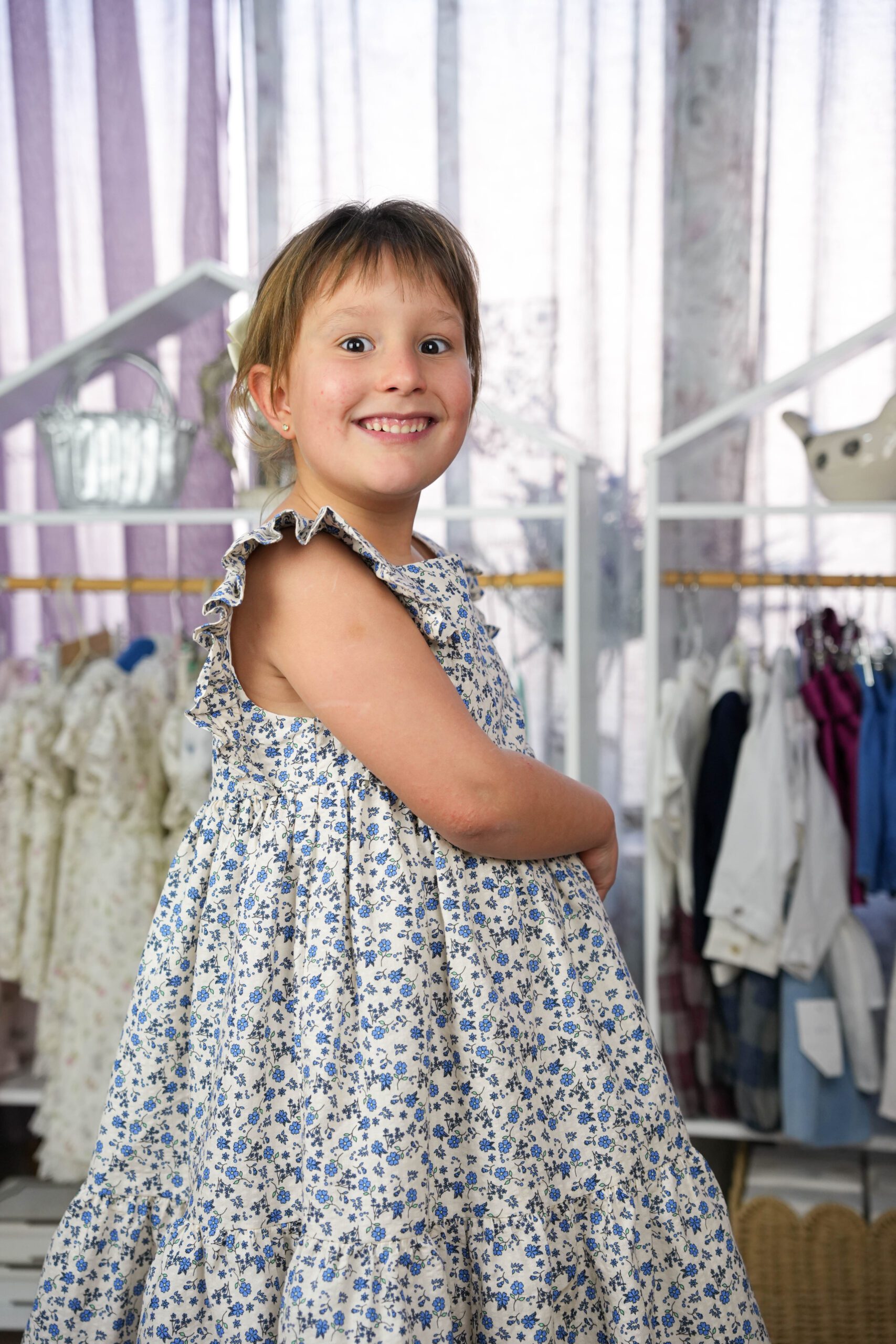 Deixe os dias ensolarados ainda mais encantadores com este vestido de menina com mini flores azuis, perfeito para a primavera e verão. Confeccionado em tecido leve e confortável, proporciona liberdade de movimento para brincar e explorar com praticidade.