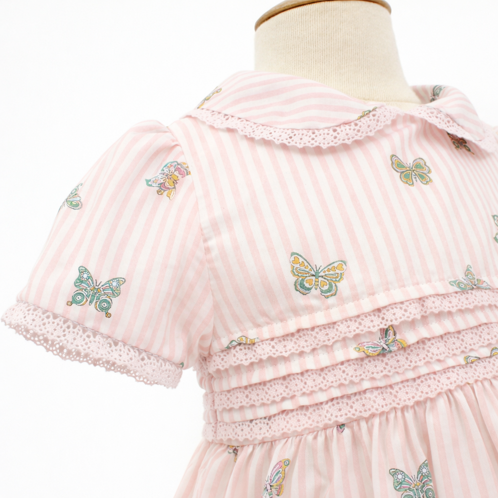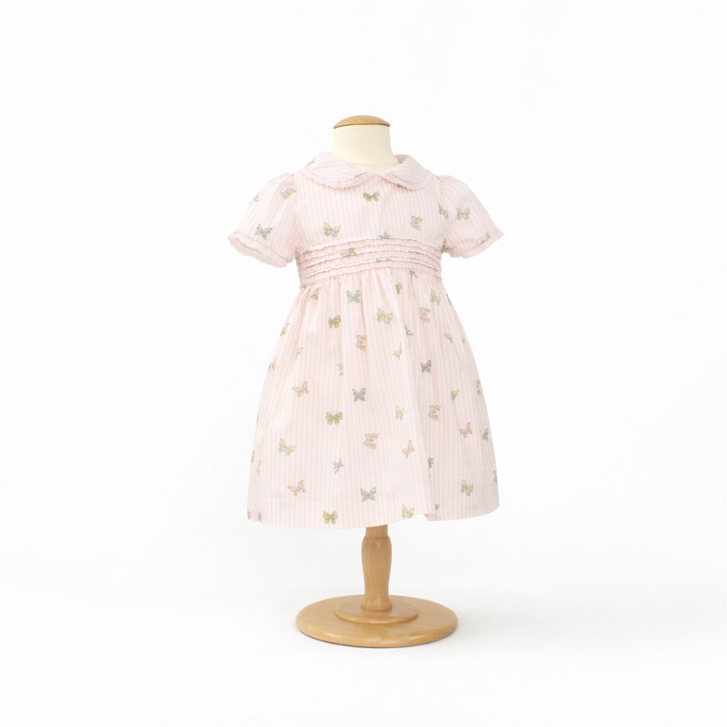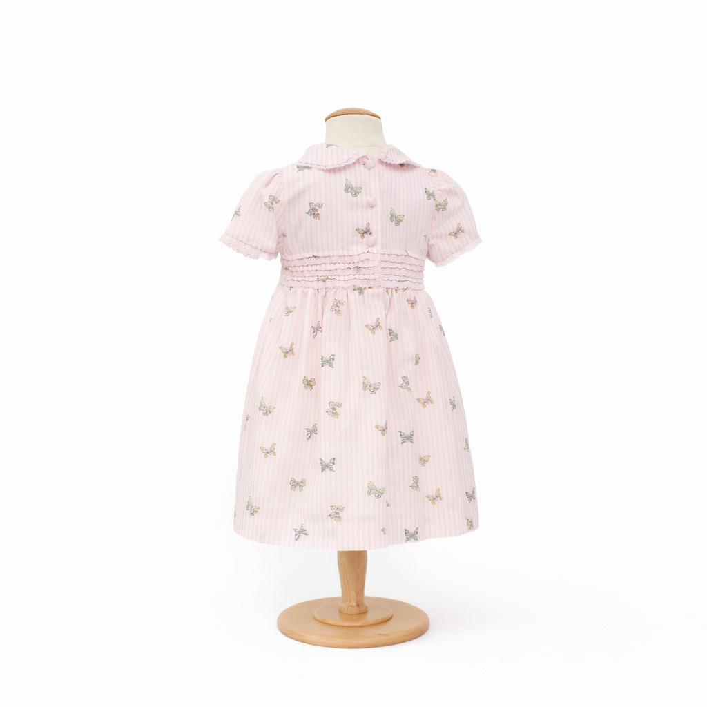 Este Vestido de Menina Borboletas em tom rosa suave destaca-se pela sua delicadeza e pelo encanto dos pequenos detalhes. Confeccionado em tecido leve de riscas finas, apresenta um padrão subtil de borboletas em tons pastel que conferem leveza e um toque poético à peça.