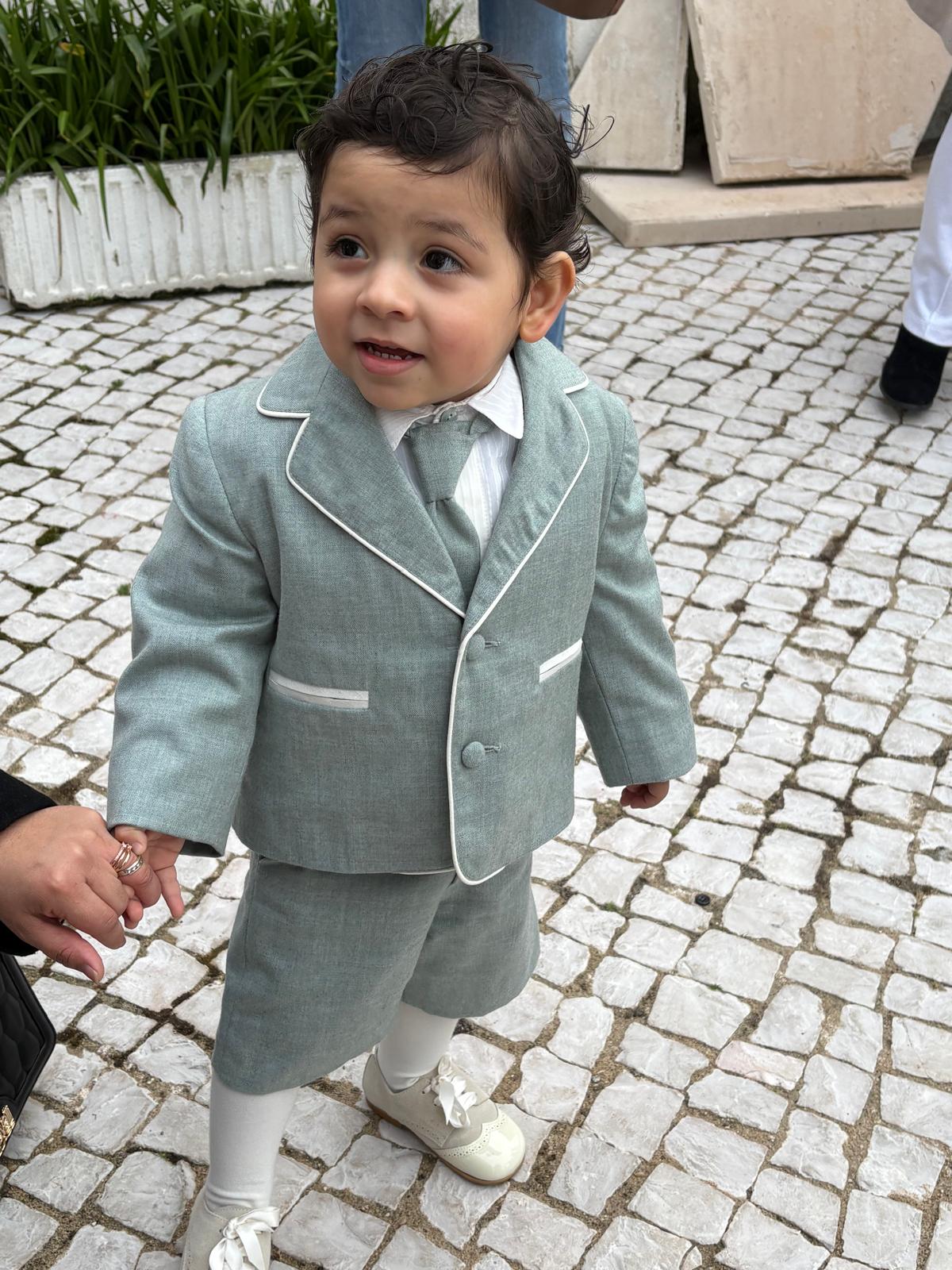 Conforto e encanto do conjunto cerimónia para menino com calção e casaco em fazenda e camisa em tecido orgânico